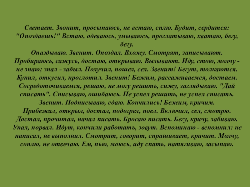 Прибежал, открыл, достал, подогрел, поел. Включил, сел, смотрю. Достал, прочитал, начал писать. Бросаю писать. Бегу, кричу, забиваю. Упал, порвал. Идут, кончили работать, зовут. Вспоминаю - вспомнил: не написал, не выполнил. Смотрит, говорит, спрашивает, кричит. Молчу, соплю, не отвечаю. Ем, пью, моюсь, иду спать, натягиваю, засыпаю.