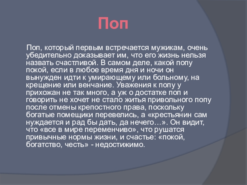 им, что его жизнь нельзя назвать счастливой. В самом деле, какой попу покой, если в любое время дня и ночи он вынужден идти к умирающему или больному, на крещение или венчание. Уважения к попу у прихожан не так много, а уж о достатке поп и говорить не хочет не стало житья привольного попу после отмены крепостного права, поскольку богатые помещики перевелись, а «крестьянин сам нуждается и рад бы дать, да нечего…». Он видит, что «все в мире переменчиво», что рушатся привычные нормы жизни, и счастье: «покой, богатство, честь» - недостижимо.
