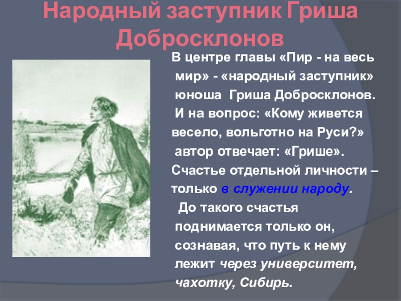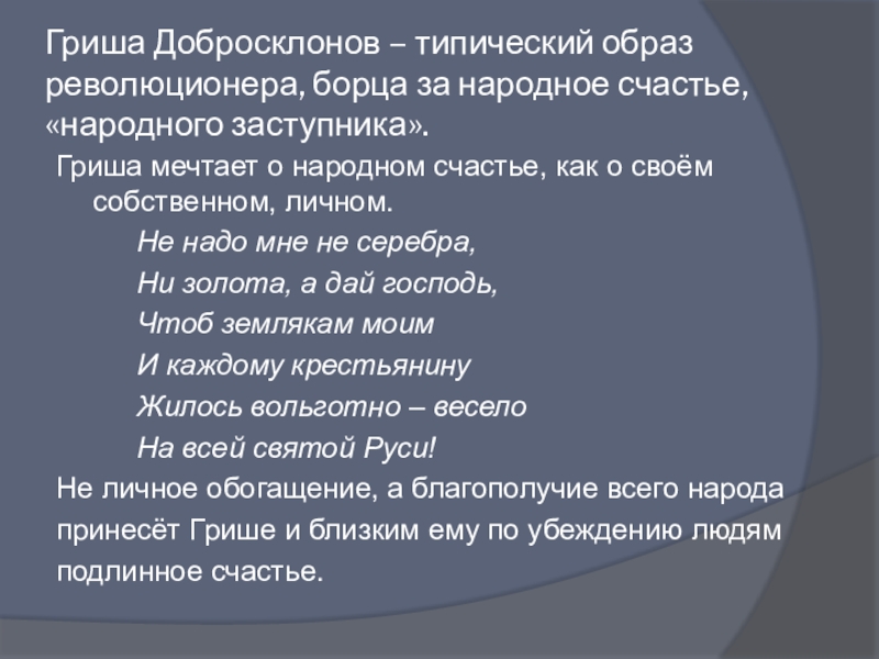 Слайд 18Гриша Добросклонов – типический образ революционера, борца за народное счастье, «народного