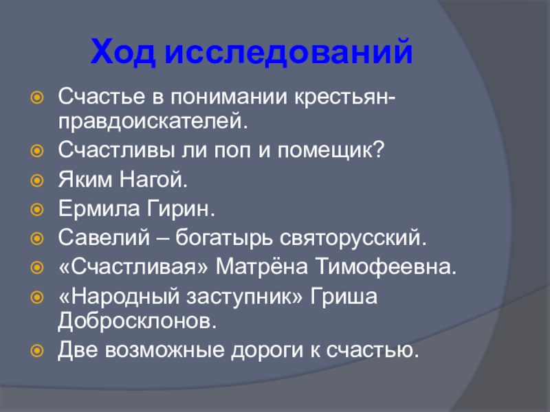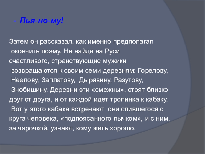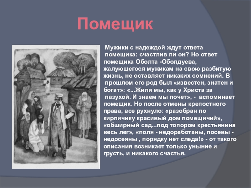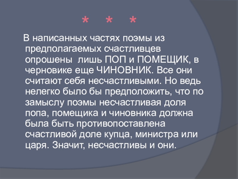 поэмы из предполагаемых счастливцев опрошены лишь ПОП и ПОМЕЩИК, в черновике еще ЧИНОВНИК. Все они считают себя несчастливыми. Но ведь нелегко было бы предположить, что по замыслу поэмы несчастливая доля попа, помещика и чиновника должна была быть противопоставлена счастливой доле купца, министра или царя. Значит, несчастливы и они.