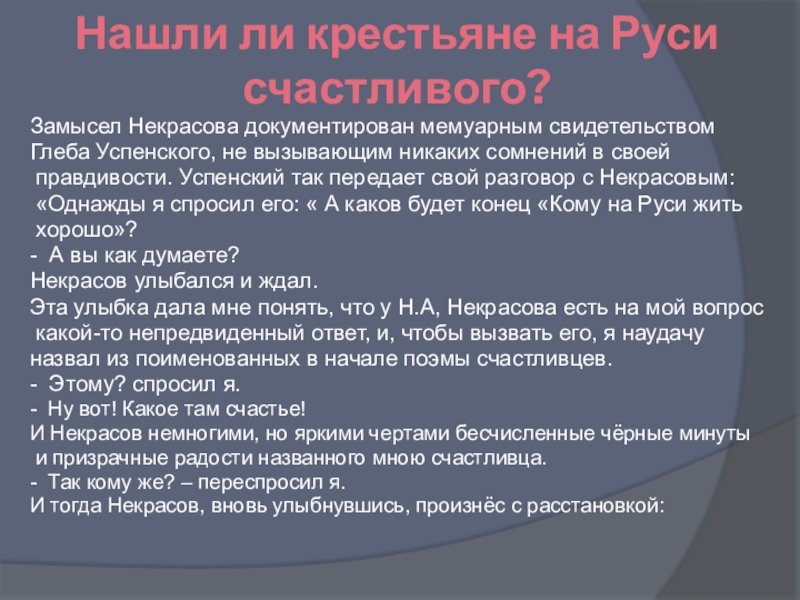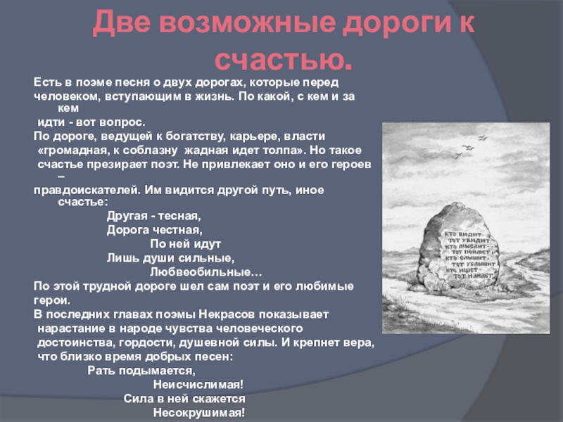 В своей поэме Некрасов ставит важнейшие этические проблемы: о смысле жизни, о совести, о правде, о доле, о счастье. Одна из таких проблем непосредственно вытекает из вопроса, сформулированного в заглавии поэмы :«Кому на Руси жить хорошо?»
