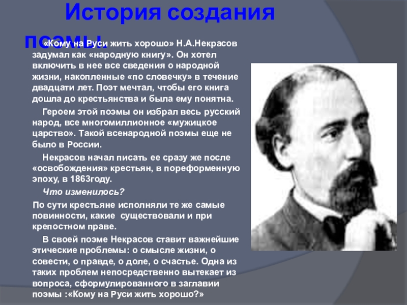 «Кому на Руси жить хорошо» Н.А.Некрасов задумал как «народную книгу». Он хотел включить в нее все сведения о народной жизни, накопленные «по словечку» в течение двадцати лет. Поэт мечтал, чтобы его книга дошла до крестьянства и была ему понятна.