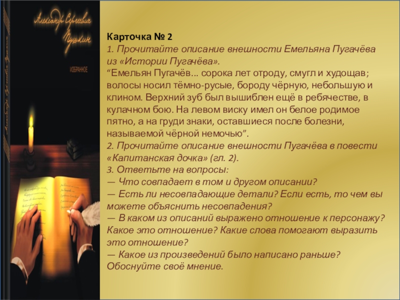 2. Прочитайте описание внешности Пугачёва в повести «Капитанская дочка» (гл. 2).