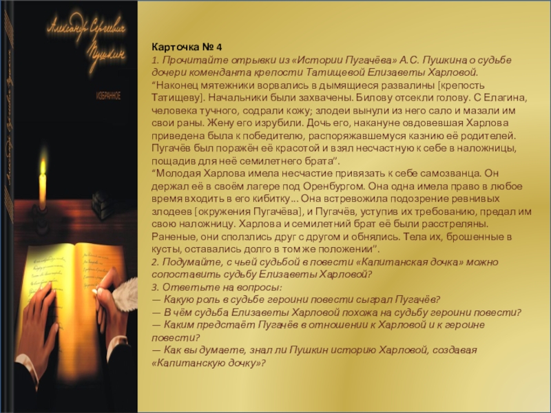 1. Прочитайте отрывки из «Истории Пугачёва» А.С. Пушкина о судьбе дочери коменданта