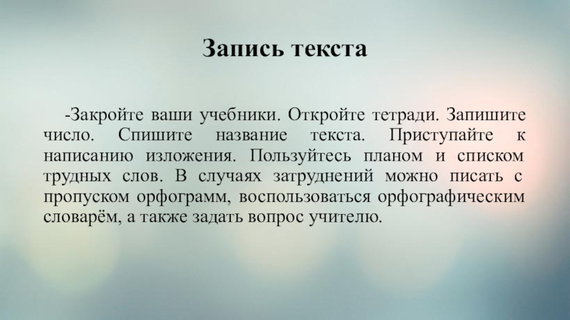 Приступайте к написанию изложения. Пользуйтесь планом и списком трудных слов. В случаях затруднений можно писать с пропуском орфограмм, воспользоваться орфографическим словарём, а также задать вопрос учителю.