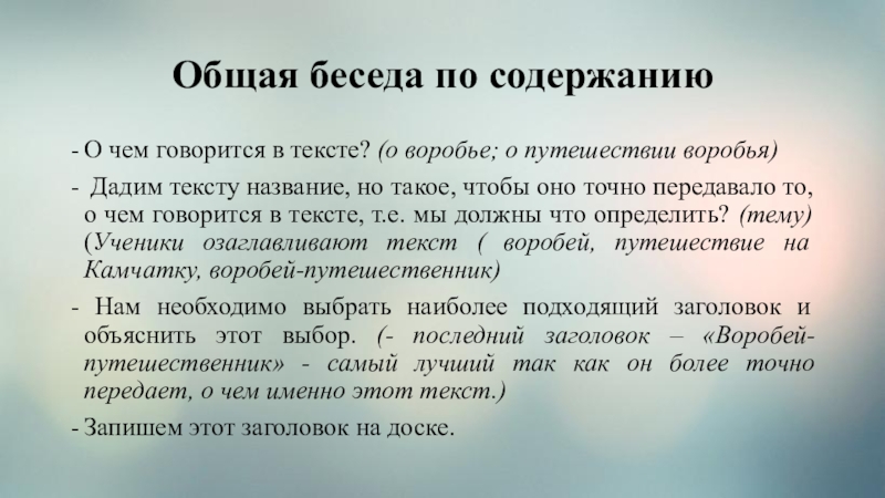 Дадим тексту название, но такое, чтобы оно точно передавало то, о чем говорится в тексте, т.е. мы должны что определить? (тему) (Ученики озаглавливают текст ( воробей, путешествие на Камчатку, воробей-путешественник)