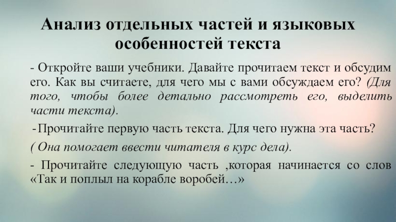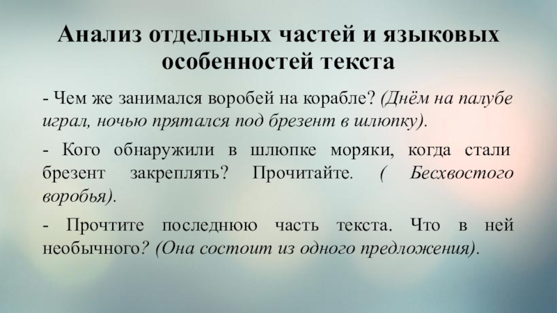 Слайд 7Анализ отдельных частей и языковых особенностей текста