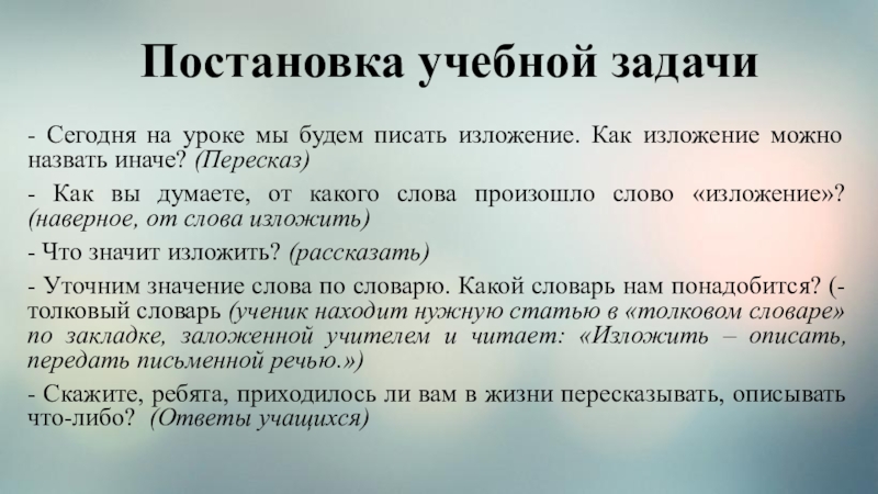 - Уточним значение слова по словарю. Какой словарь нам понадобится? (- толковый словарь (ученик находит нужную статью в «толковом словаре» по закладке, заложенной учителем и читает: «Изложить – описать, передать письменной речью.»)
