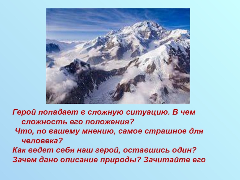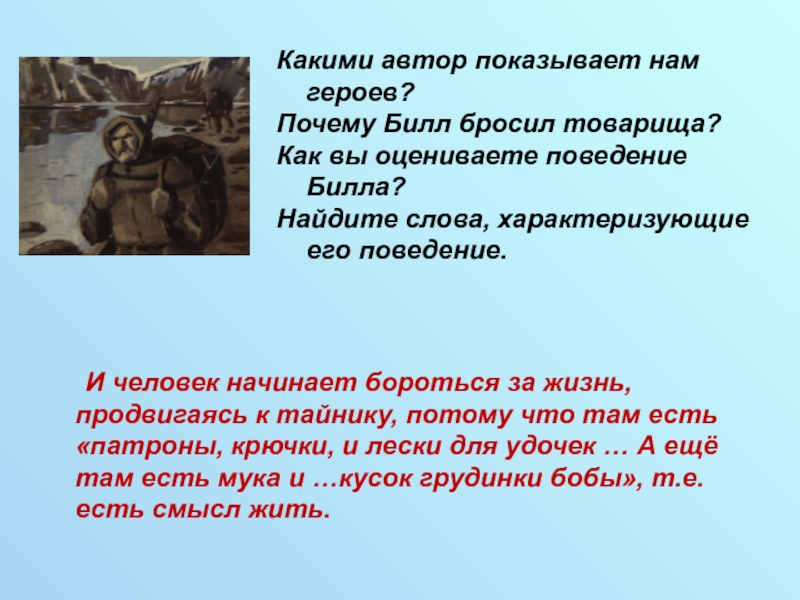 И человек начинает бороться за жизнь, продвигаясь к тайнику, потому что там есть «патроны, крючки, и лески для удочек … А ещё там есть мука и …кусок грудинки бобы», т.е. есть смысл жить.