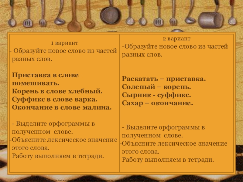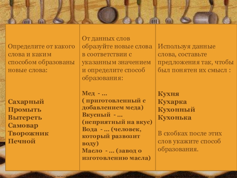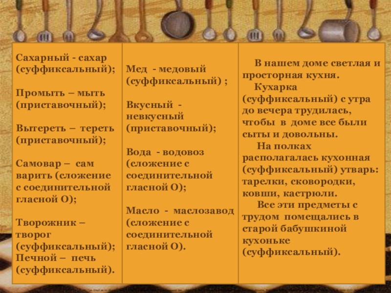 Кухарка (суффиксальный) с утра до вечера трудилась, чтобы в доме все были сыты и довольны.