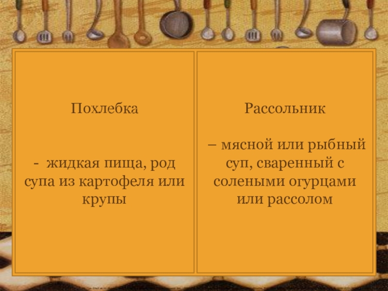 На полках располагалась кухонная (суффиксальный) утварь: тарелки, сковородки, ковши, кастрюли.