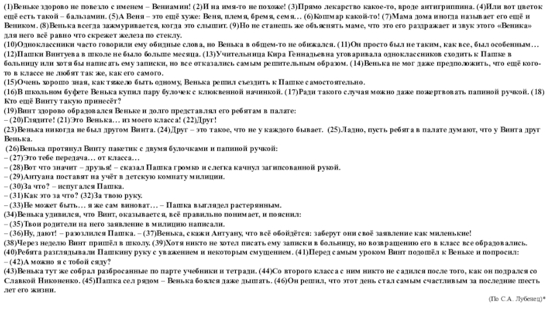 (10)Одноклассники часто говорили ему обидные слова, но Венька в общем-то не обижался. (11)Он просто был не таким, как все, был особенным…