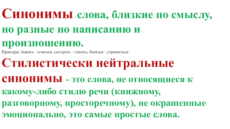 Стилистически нейтральные синонимы - это слова, не относящиеся к какому-либо стилю речи (книжному, разговорному, просторечному), не окрашенные эмоционально, это самые простые слова.