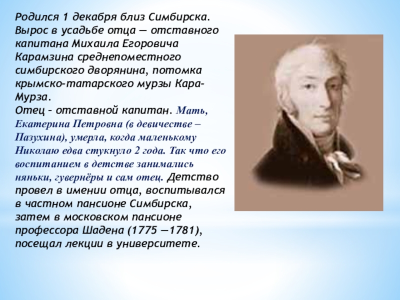Михаила Егоровича Карамзина среднепоместного симбирского дворянина, потомка крымско-татарского мурзы Кара-Мурза.