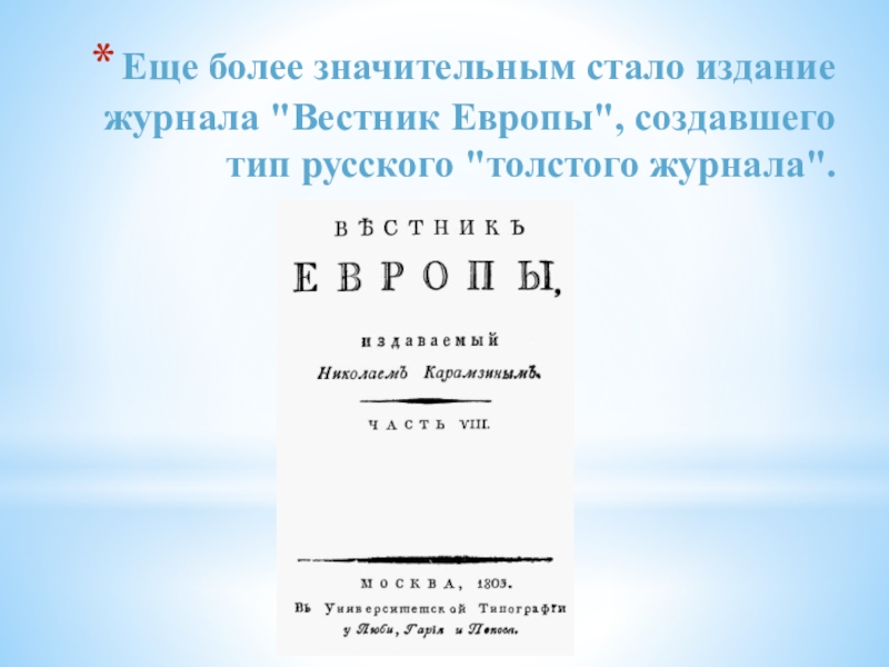 Слайд 20Еще более значительным стало издание журнала "Вестник Европы", создавшего тип русского