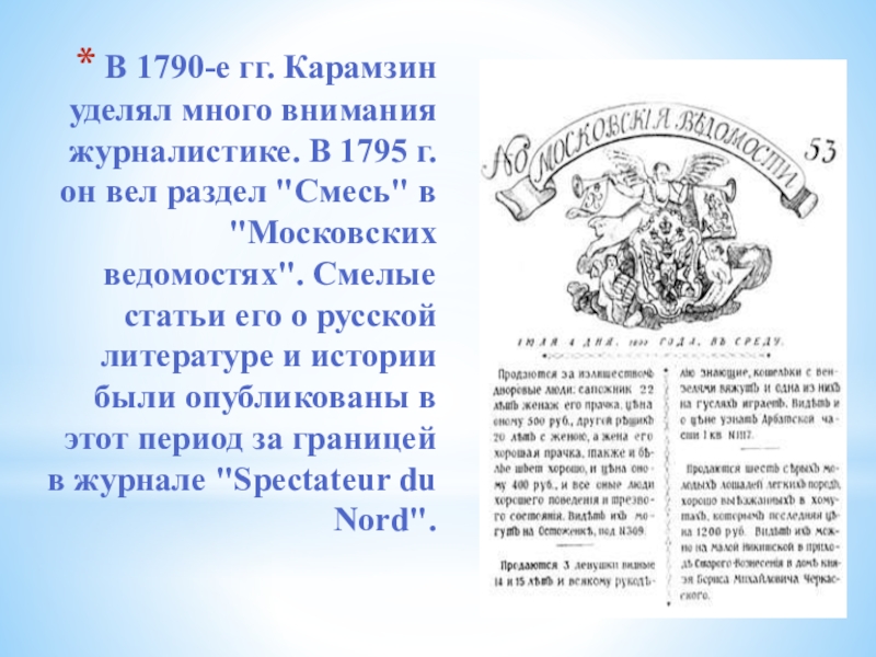 Слайд 18В 1790-е гг. Карамзин уделял много внимания журналистике. В 1795 г.