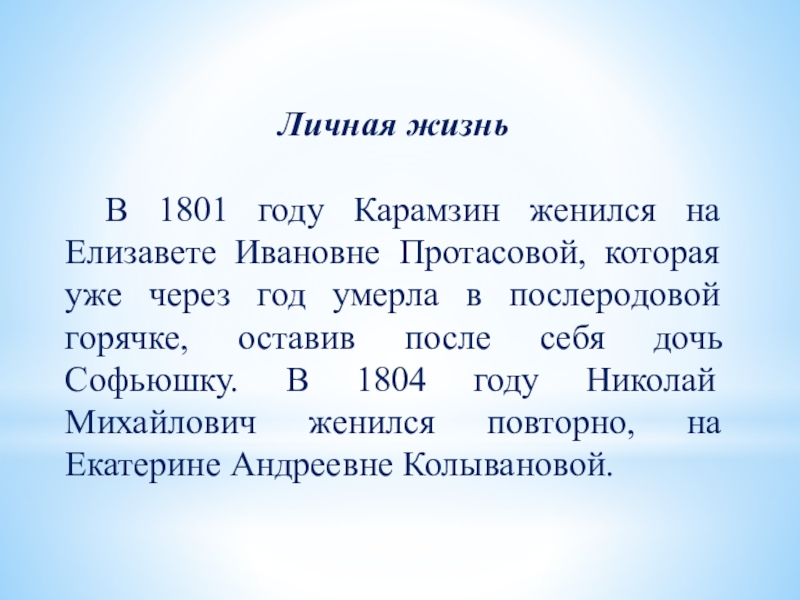 В 1801 году Карамзин женился на Елизавете Ивановне Протасовой, которая