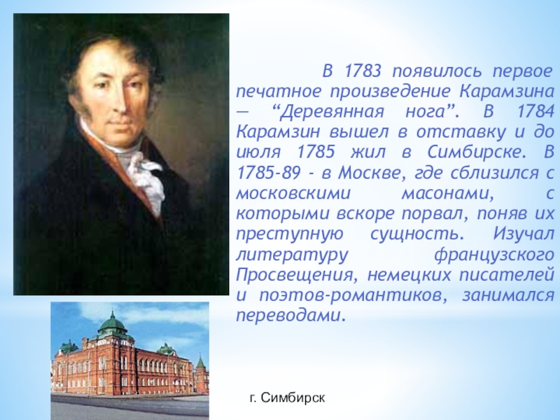 произведение Карамзина — “Деревянная нога”. В 1784 Карамзин вышел в отставку и до июля 1785 жил в Симбирске. В 1785-89 - в Москве, где сблизился с московскими масонами, с которыми вскоре порвал, поняв их преступную сущность. Изучал литературу французского Просвещения, немецких писателей и поэтов-романтиков, занимался переводами.