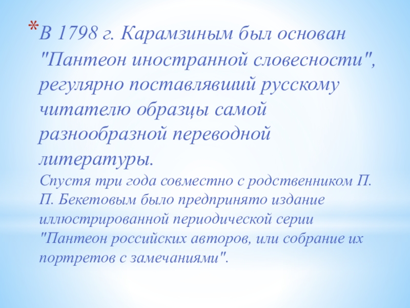 Слайд 19В 1798 г. Карамзиным был основан "Пантеон иностранной словесности", регулярно поставлявший