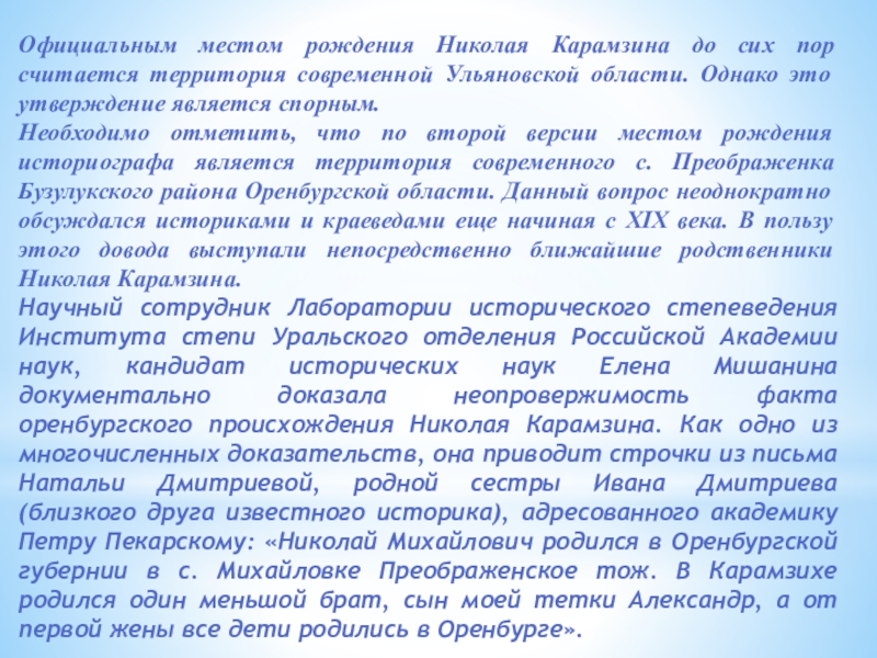 Слайд 4Официальным местом рождения Николая Карамзина до сих пор считается территория современной
