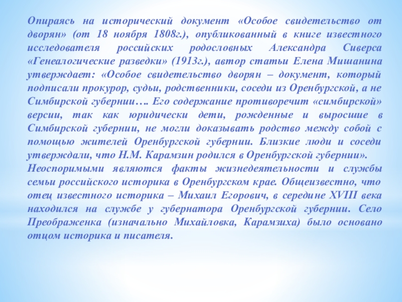 1808г.), опубликованный в книге известного исследователя российских родословных Александра Сиверса «Генеалогические разведки» (1913г.), автор статьи Елена Мишанина утверждает: «Особое свидетельство дворян – документ, который подписали прокурор, судьи, родственники, соседи из Оренбургской, а не Симбирской губернии…. Его содержание противоречит «симбирской» версии, так как юридически дети, рожденные и выросшие в Симбирской губернии, не могли доказывать родство между собой с помощью жителей Оренбургской губернии. Близкие люди и соседи утверждали, что Н.М. Карамзин родился в Оренбургской губернии».