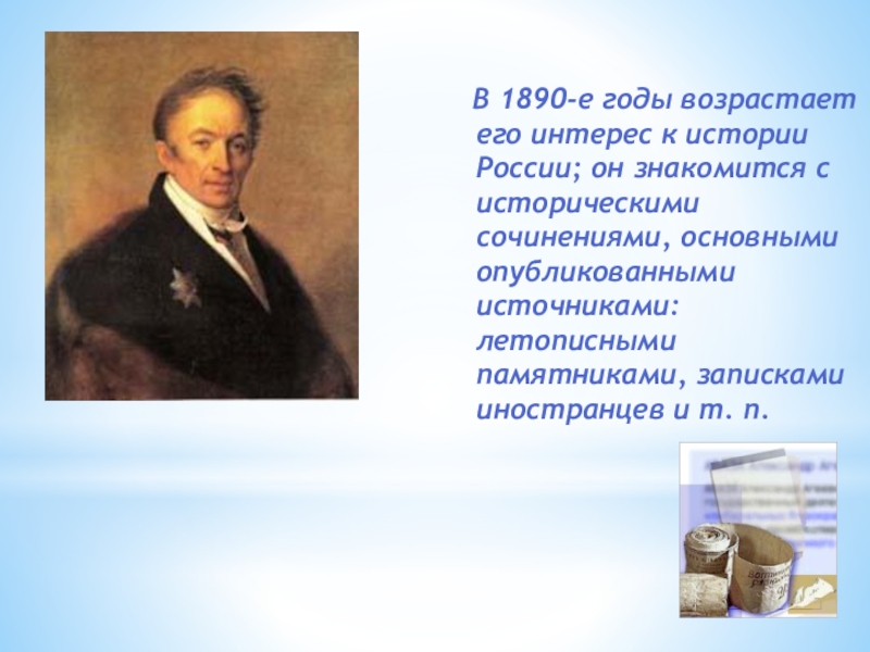 В 1890-е годы возрастает его интерес к истории России; он