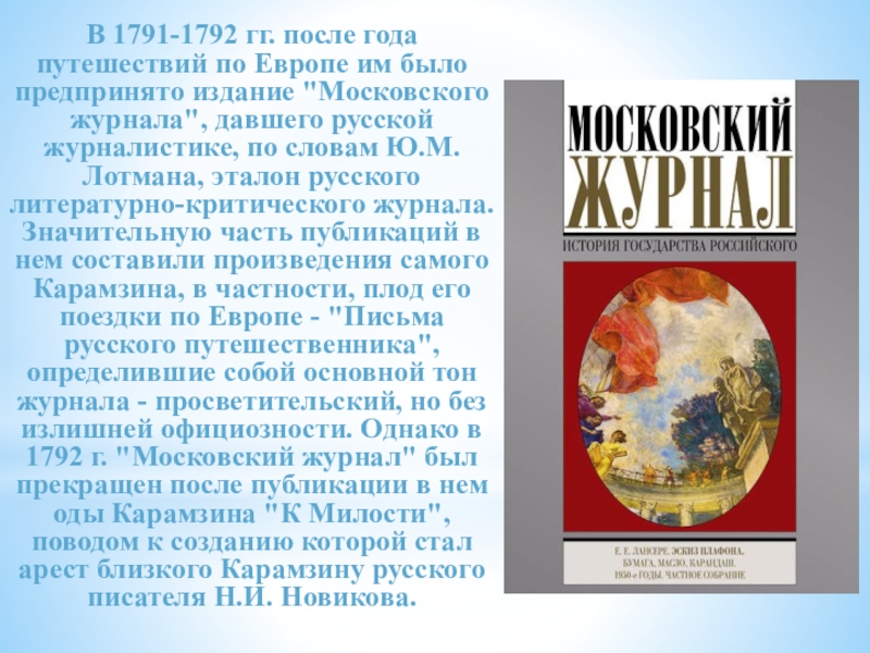 издание "Московского журнала", давшего русской журналистике, по словам Ю.М. Лотмана, эталон русского литературно-критического журнала. Значительную часть публикаций в нем составили произведения самого Карамзина, в частности, плод его поездки по Европе - "Письма русского путешественника", определившие собой основной тон журнала - просветительский, но без излишней официозности. Однако в 1792 г. "Московский журнал" был прекращен после публикации в нем оды Карамзина "К Милости", поводом к созданию которой стал арест близкого Карамзину русского писателя Н.И. Новикова.