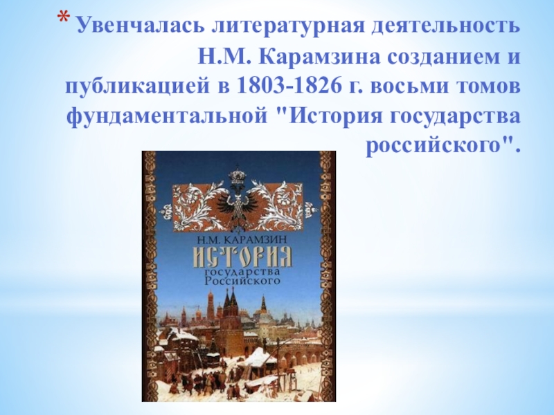 Слайд 23Увенчалась литературная деятельность Н.М. Карамзина созданием и публикацией в 1803-1826 г.