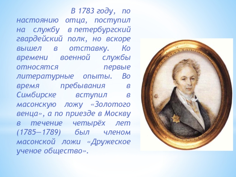 службу в петербургский гвардейский полк, но вскоре вышел в отставку. Ко времени военной службы относятся первые литературные опыты. Во время пребывания в Симбирске вступил в масонскую ложу «Золотого венца», а по приезде в Москву в течение четырёх лет (1785—1789) был членом масонской ложи «Дружеское ученое общество».