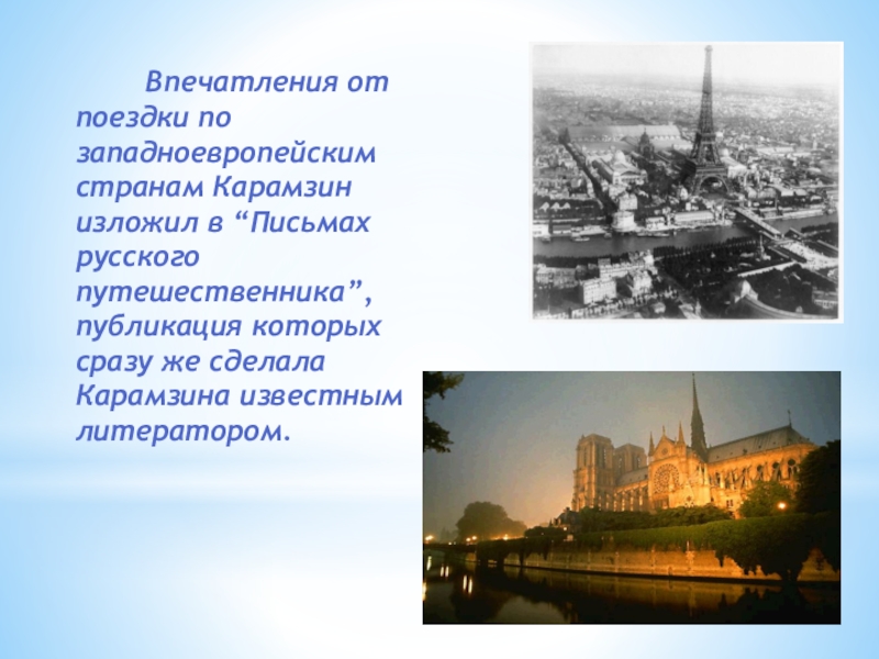 Впечатления от поездки по западноевропейским странам Карамзин изложил в “Письмах русского путешественника”, публикация которых сразу же сделала Карамзина известным литератором.