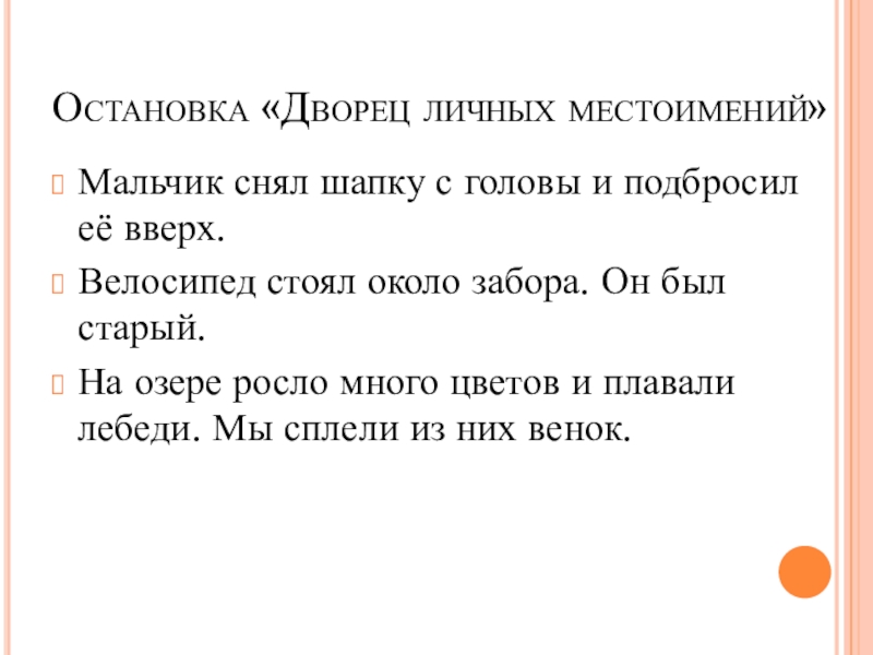 Остановка «Дворец личных местоимений»Мальчик снял шапку с головы и подбросил её вверх.Велосипед стоял около забора. Он был