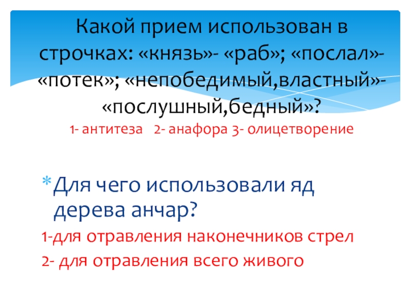Какой прием использован в строчках: «князь»- «раб»; «послал»- «потек»; «непобедимый,властный»- «послушный,бедный»?