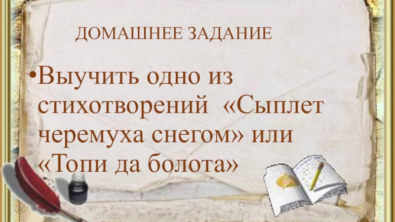 ДОМАШНЕЕ ЗАДАНИЕВыучить одно из стихотворений «Сыплет черемуха снегом» или «Топи да болота»