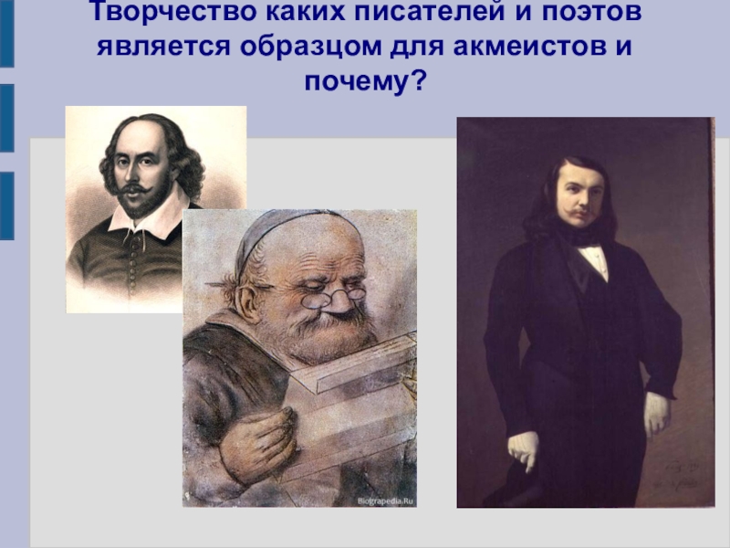 Слайд 21Творчество каких писателей и поэтов является образцом для акмеистов и почему?