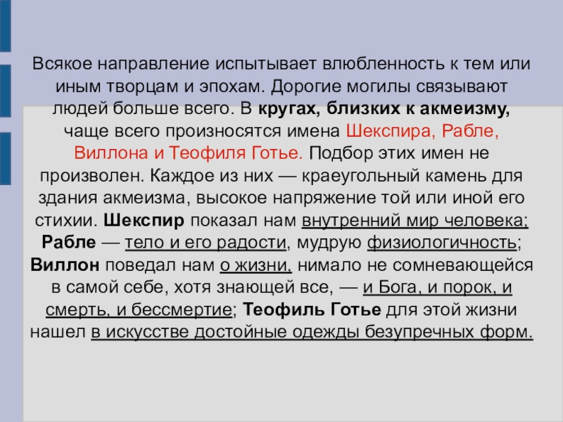 Дорогие могилы связывают людей больше всего. В кругах, близких к акмеизму, чаще всего произносятся имена Шекспира, Рабле, Виллона и Теофиля Готье. Подбор этих имен не произволен. Каждое из них — краеугольный камень для здания акмеизма, высокое напряжение той или иной его стихии. Шекспир показал нам внутренний мир человека; Рабле — тело и его радости, мудрую физиологичность; Виллон поведал нам о жизни, нимало не сомневающейся в самой себе, хотя знающей все, — и Бога, и порок, и смерть, и бессмертие; Теофиль Готье для этой жизни нашел в искусстве достойные одежды безупречных форм.