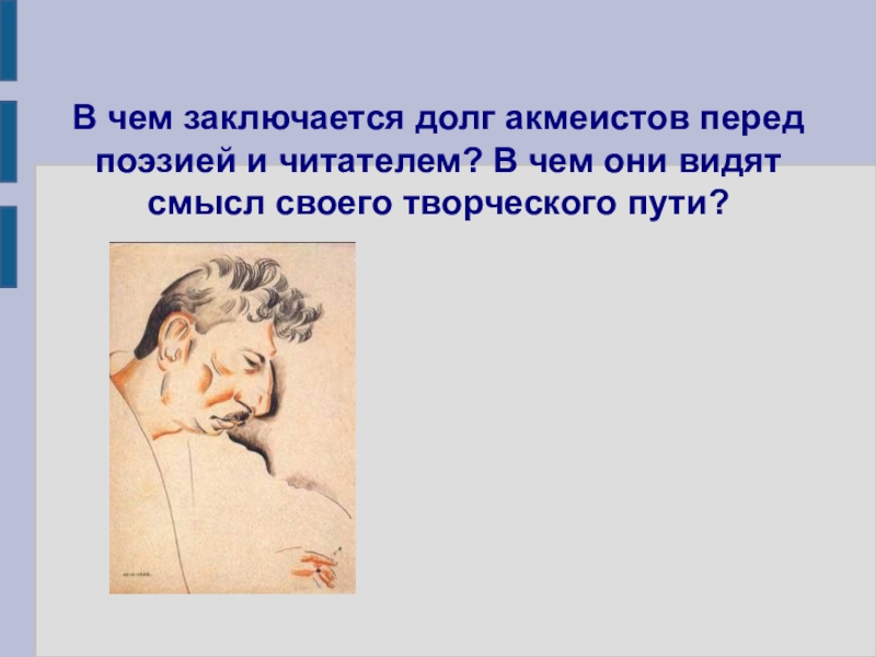 Слайд 15В чем заключается долг акмеистов перед поэзией и читателем? В чем
