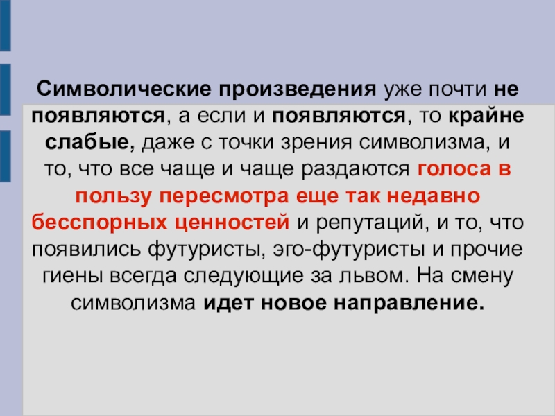 крайне слабые, даже с точки зрения символизма, и то, что все чаще и чаще раздаются голоса в пользу пересмотра еще так недавно бесспорных ценностей и репутаций, и то, что появились футуристы, эго-футуристы и прочие гиены всегда следующие за львом. На смену символизма идет новое направление.