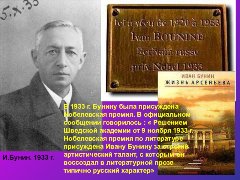 С 1927 по 1939 г. И.Бунин работал над одной из лучших своих книг «Жизнь Арсеньева»