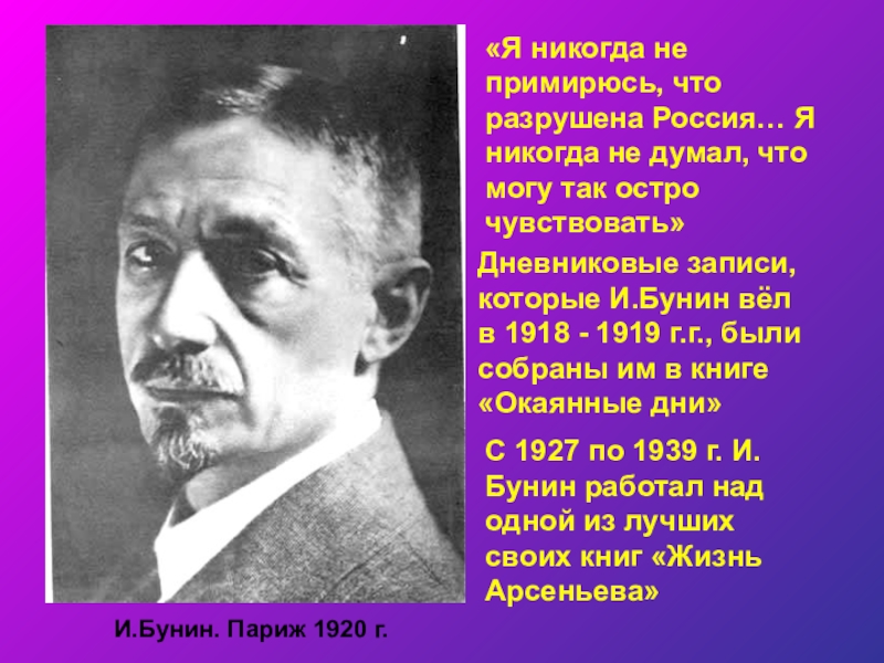 Не приняв власть большевиков, Бунин вынужден был в 1920 г. покинуть Россию