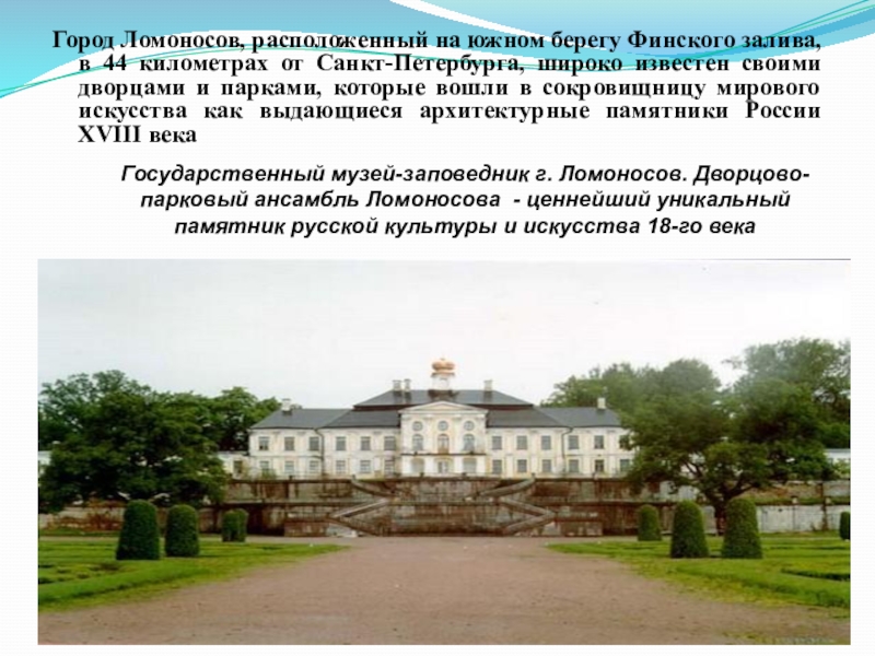 Государственный музей-заповедник г. Ломоносов. Дворцово-парковый ансамбль Ломоносова - ценнейший уникальный памятник русской культуры и искусства 18-го века