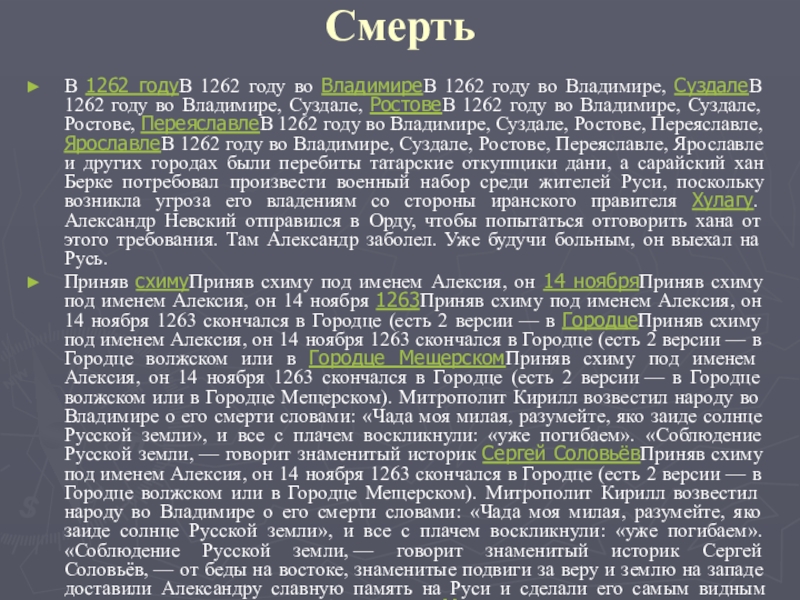 Приняв схимуПриняв схиму под именем Алексия, он 14 ноябряПриняв схиму под именем Алексия, он 14 ноября 1263Приняв схиму под именем Алексия, он 14 ноября 1263 скончался в Городце (есть 2 версии — в ГородцеПриняв схиму под именем Алексия, он 14 ноября 1263 скончался в Городце (есть 2 версии — в Городце волжском или в Городце МещерскомПриняв схиму под именем Алексия, он 14 ноября 1263 скончался в Городце (есть 2 версии — в Городце волжском или в Городце Мещерском). Митрополит Кирилл возвестил народу во Владимире о его смерти словами: «Чада моя милая, разумейте, яко заиде солнце Русской земли», и все с плачем воскликнули: «уже погибаем». «Соблюдение Русской земли, — говорит знаменитый историк Сергей СоловьёвПриняв схиму под именем Алексия, он 14 ноября 1263 скончался в Городце (есть 2 версии — в Городце волжском или в Городце Мещерском). Митрополит Кирилл возвестил народу во Владимире о его смерти словами: «Чада моя милая, разумейте, яко заиде солнце Русской земли», и все с плачем воскликнули: «уже погибаем». «Соблюдение Русской земли, — говорит знаменитый историк Сергей Соловьёв, — от беды на востоке, знаменитые подвиги за веру и землю на западе доставили Александру славную память на Руси и сделали его самым видным историческим лицом в древней истории от МономахаПриняв схиму под именем Алексия, он 14 ноября 1263 скончался в Городце (есть 2 версии — в Городце волжском или в Городце Мещерском). Митрополит Кирилл возвестил народу во Владимире о его смерти словами: «Чада моя милая, разумейте, яко заиде солнце Русской земли», и все с плачем воскликнули: «уже погибаем». «Соблюдение Русской земли, — говорит знаменитый историк Сергей Соловьёв, — от беды на востоке, знаменитые подвиги за веру и землю на западе доставили Александру славную память на Руси и сделали его самым видным историческим лицом в древней истории от Мономаха до ДонскогоПриняв схиму под именем Алексия, он 14 ноября 1263 скончался в Городце (есть 2 версии — в Городце волжском или в Городце Мещерском). Митрополит Кирилл возвестил народу во Владимире о его смерти словами: «Чада моя милая, разумейте, яко заиде солнце Русской земли», и все с плачем воскликнули: «уже погибаем». «Соблюдение Русской земли, — говорит знаменитый историк Сергей Соловьёв, — от беды на востоке, знаменитые подвиги за веру и землю на западе доставили Александру славную память на Руси и сделали его самым видным историческим лицом в древней истории от Мономаха до Донского». Александр сделался любимым князем духовенства. В дошедшем до нас летописном сказании о подвигах его говорится, что он «Богом рожен». Побеждая везде, он никем не был побеждён. Рыцарь, пришедший с запада посмотреть Невского, рассказывал, что он прошёл много стран и народов, но нигде не видал такого «ни в царях царя, ни в князьях князя». Такой же отзыв будто бы дал о нём и сам хан татарский, а женщины татарские его именем пугали детей.