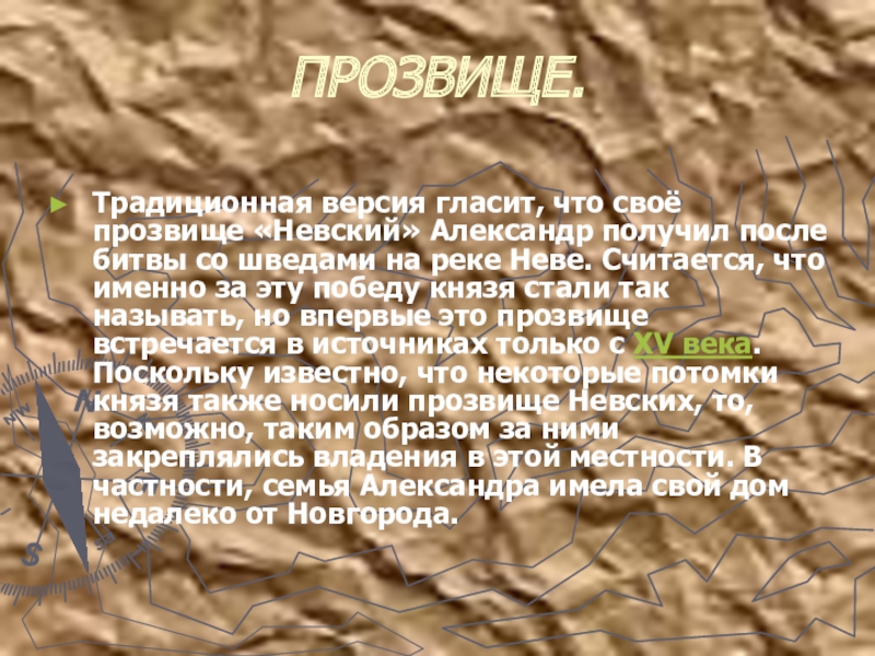 со шведами на реке Неве. Считается, что именно за эту победу князя стали так называть, но впервые это прозвище встречается в источниках только с XV века. Поскольку известно, что некоторые потомки князя также носили прозвище Невских, то, возможно, таким образом за ними закреплялись владения в этой местности. В частности, семья Александра имела свой дом недалеко от Новгорода.