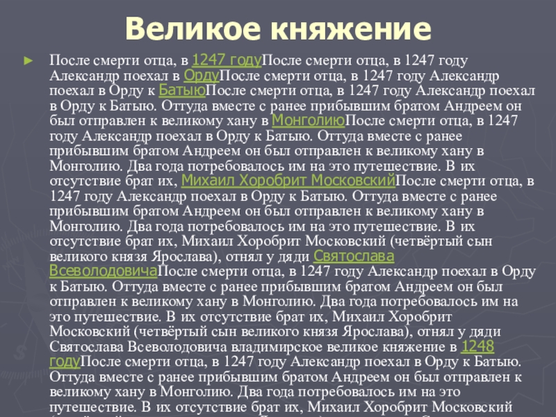 году Александр поехал в ОрдуПосле смерти отца, в 1247 году Александр поехал в Орду к БатыюПосле смерти отца, в 1247 году Александр поехал в Орду к Батыю. Оттуда вместе с ранее прибывшим братом Андреем он был отправлен к великому хану в МонголиюПосле смерти отца, в 1247 году Александр поехал в Орду к Батыю. Оттуда вместе с ранее прибывшим братом Андреем он был отправлен к великому хану в Монголию. Два года потребовалось им на это путешествие. В их отсутствие брат их, Михаил Хоробрит МосковскийПосле смерти отца, в 1247 году Александр поехал в Орду к Батыю. Оттуда вместе с ранее прибывшим братом Андреем он был отправлен к великому хану в Монголию. Два года потребовалось им на это путешествие. В их отсутствие брат их, Михаил Хоробрит Московский (четвёртый сын великого князя Ярослава), отнял у дяди Святослава ВсеволодовичаПосле смерти отца, в 1247 году Александр поехал в Орду к Батыю. Оттуда вместе с ранее прибывшим братом Андреем он был отправлен к великому хану в Монголию. Два года потребовалось им на это путешествие. В их отсутствие брат их, Михаил Хоробрит Московский (четвёртый сын великого князя Ярослава), отнял у дяди Святослава Всеволодовича владимирское великое княжение в 1248 годуПосле смерти отца, в 1247 году Александр поехал в Орду к Батыю. Оттуда вместе с ранее прибывшим братом Андреем он был отправлен к великому хану в Монголию. Два года потребовалось им на это путешествие. В их отсутствие брат их, Михаил Хоробрит Московский (четвёртый сын великого князя Ярослава), отнял у дяди Святослава Всеволодовича владимирское великое княжение в 1248 году, но в том же году погиб в бою с литовцамиПосле смерти отца, в 1247 году Александр поехал в Орду к Батыю. Оттуда вместе с ранее прибывшим братом Андреем он был отправлен к великому хану в Монголию. Два года потребовалось им на это путешествие. В их отсутствие брат их, Михаил Хоробрит Московский (четвёртый сын великого князя Ярослава), отнял у дяди Святослава Всеволодовича владимирское великое княжение в 1248 году, но в том же году погиб в бою с литовцами в битве на реке ПротвеПосле смерти отца, в 1247 году Александр поехал в Орду к Батыю. Оттуда вместе с ранее прибывшим братом Андреем он был отправлен к великому хану в Монголию. Два года потребовалось им на это путешествие. В их отсутствие брат их, Михаил Хоробрит Московский (четвёртый сын великого князя Ярослава), отнял у дяди Святослава Всеволодовича владимирское великое княжение в 1248 году, но в том же году погиб в бою с литовцами в битве на реке Протве. Святославу удалось разбить литовцев у ЗубцоваПосле смерти отца, в 1247 году Александр поехал в Орду к Батыю. Оттуда вместе с ранее прибывшим братом Андреем он был отправлен к великому хану в Монголию. Два года потребовалось им на это путешествие. В их отсутствие брат их, Михаил Хоробрит Московский (четвёртый сын великого князя Ярослава), отнял у дяди Святослава Всеволодовича владимирское великое княжение в 1248 году, но в том же году погиб в бою с литовцами в битве на реке Протве. Святославу удалось разбить литовцев у Зубцова. Батый планировал отдать владимирское великое княжение Александру, но согласно завещанию Ярослава владимирским князем должен был стать Андрей, а новгородским и киевским — Александр. И летописец отмечает, что у них была «пря велия о великом княжении». В итоге правителями Монгольской империи, не