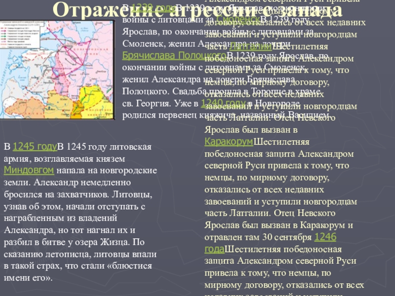 Шестилетняя победоносная защита Александром северной Руси привела к тому, что немцы, по мирному договору, отказались от всех недавних завоеваний и уступили новгородцам часть ЛатгалииШестилетняя победоносная защита Александром северной Руси привела к тому, что немцы, по мирному договору, отказались от всех недавних завоеваний и уступили новгородцам часть Латгалии. Отец Невского Ярослав был вызван в КаракорумШестилетняя победоносная защита Александром северной Руси привела к тому, что немцы, по мирному договору, отказались от всех недавних завоеваний и уступили новгородцам часть Латгалии. Отец Невского Ярослав был вызван в Каракорум и отравлен там 30 сентября 1246 годаШестилетняя победоносная защита Александром северной Руси привела к тому, что немцы, по мирному договору, отказались от всех недавних завоеваний и уступили новгородцам часть Латгалии. Отец Невского Ярослав был вызван в Каракорум и отравлен там 30 сентября 1246 года. Почти одновременно с этим 20 сентября в Золотой Орде был убит Михаил Черниговский, отказавшийся пройти языческий обряд.
