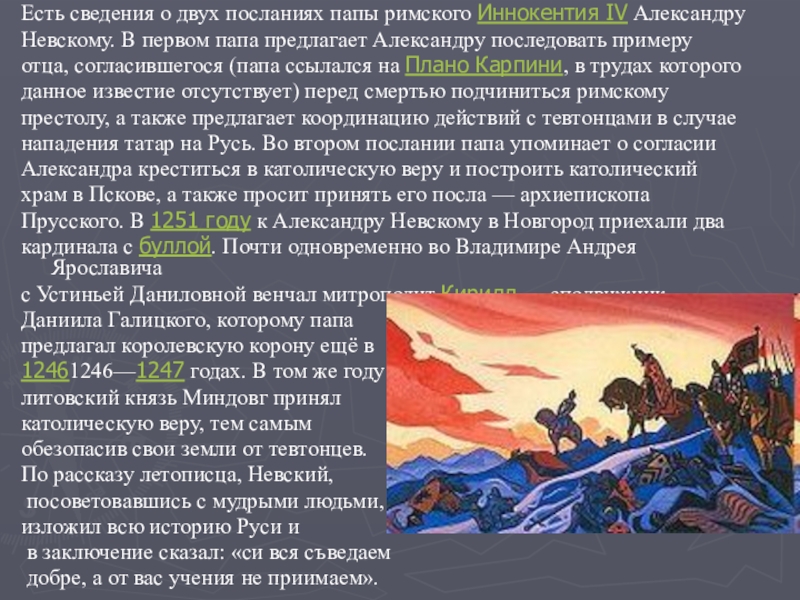 Слайд 6Есть сведения о двух посланиях папы римского Иннокентия IV Александру