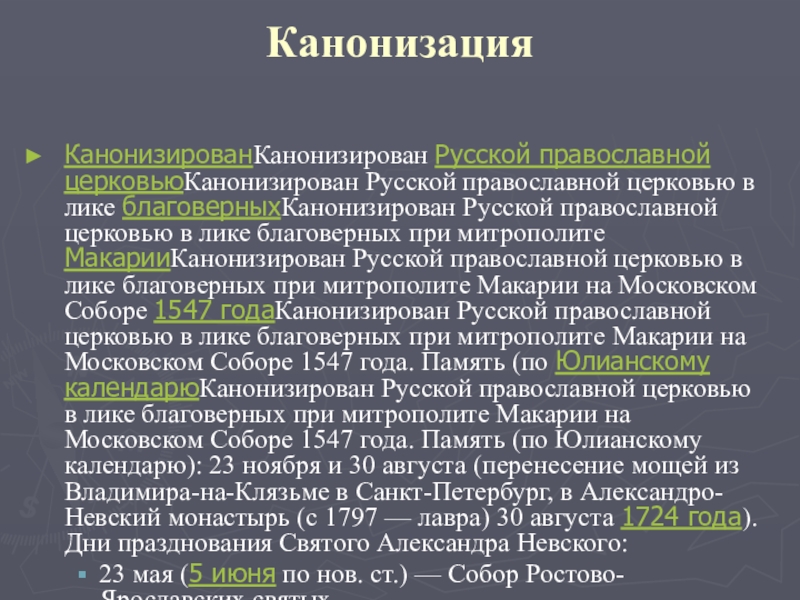 православной церковью в лике благоверных при митрополите МакарииКанонизирован Русской православной церковью в лике благоверных при митрополите Макарии на Московском Соборе 1547 годаКанонизирован Русской православной церковью в лике благоверных при митрополите Макарии на Московском Соборе 1547 года. Память (по Юлианскому календарюКанонизирован Русской православной церковью в лике благоверных при митрополите Макарии на Московском Соборе 1547 года. Память (по Юлианскому календарю): 23 ноября и 30 августа (перенесение мощей из Владимира-на-Клязьме в Санкт-Петербург, в Александро-Невский монастырь (с 1797 — лавра) 30 августа 1724 года). Дни празднования Святого Александра Невского: