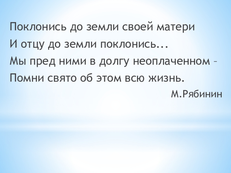 Поклонись до земли своей материИ отцу до земли поклонись...Мы пред ними в долгу неоплаченном –Помни свято об