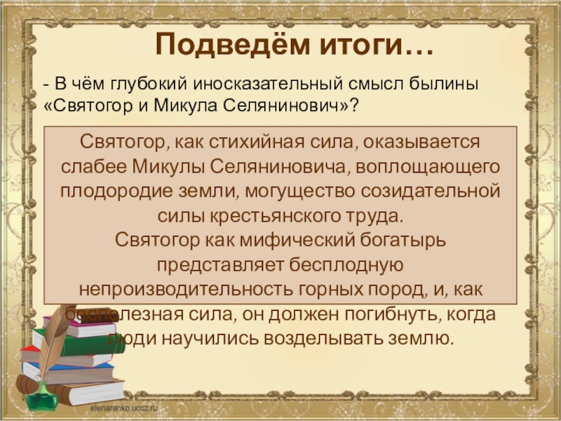 Святогор, как стихийная сила, оказывается слабее Микулы Селяниновича, воплощающего плодородие земли, могущество созидательной силы крестьянского труда.