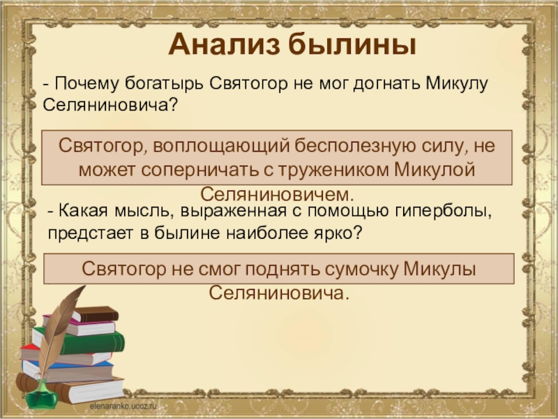 - Какая мысль, выраженная с помощью гиперболы, предстает в былине наиболее ярко?