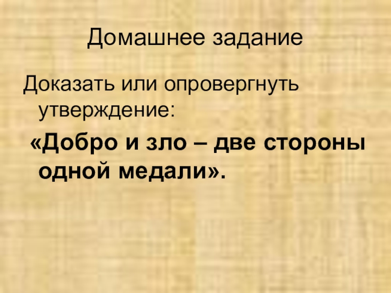 Домашнее заданиеДоказать или опровергнуть утверждение: «Добро и зло – две стороны одной медали».